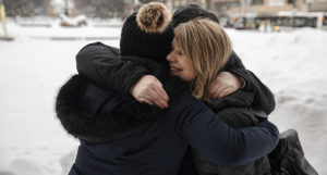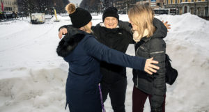 Linda Munther, Beatrice Färdigs och Isabelle Dahlqvist, som gift sig och bytt efternamn till John, möts i stora kramar på Rådhusets trappa i Gävle.