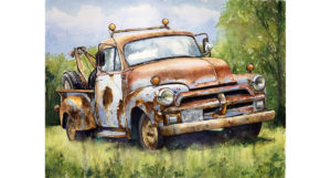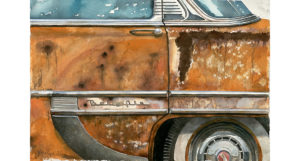 Han tecknar den suggestiva känslan av att vandra runt på en bilkyrkogård. Här och var i ett böljande landskap tittar gamla skrotbilar fram.