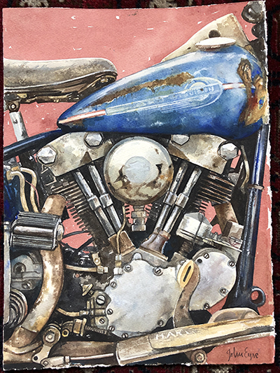 I sitt arbetsrum på Söder i Stockholm har John Eyre ställt upp en liten miniutställning av gamla jänkare och hojar. Porträtt, säger han själv, i rost och förfall. Han går ofta tätt inpå en dörr eller karossida, jobbar med detaljer.