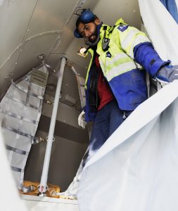 För att ta sig in i lastrummet passerar arbetarna en 34 centimeter hög tröskel. Där har de som mest 142 centimeter till taket, men sedan smalnar i utrymmet av mot flygplansstjärten.
