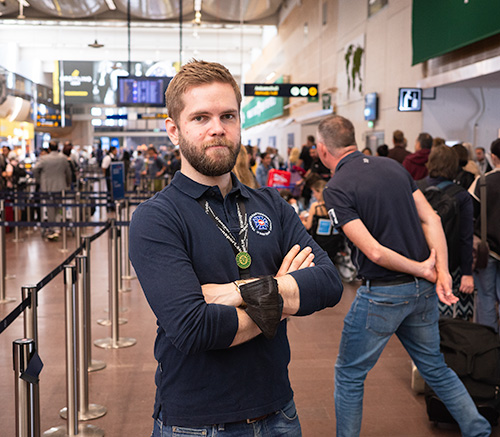 Vid SAS-hangarens grind 1 får eleverna, precis som resenärerna, gå genom en säkerhetskontroll. En badge, elektronisk nyckel, ger tillträde till olika lokaler i de myllrande gångarna som passagerarna aldrig ser. För Transportarbetarens reporter krävs en ledsagare, Juan Villar Moya, som alla kallar ”Sjuan”.