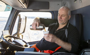 Lars Sjölund stannar vid vägkanten för att tömma. Det är 28 grader kallt. En torr kyla som ritar iskristaller på sidorutorna inne i hytten.