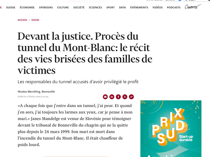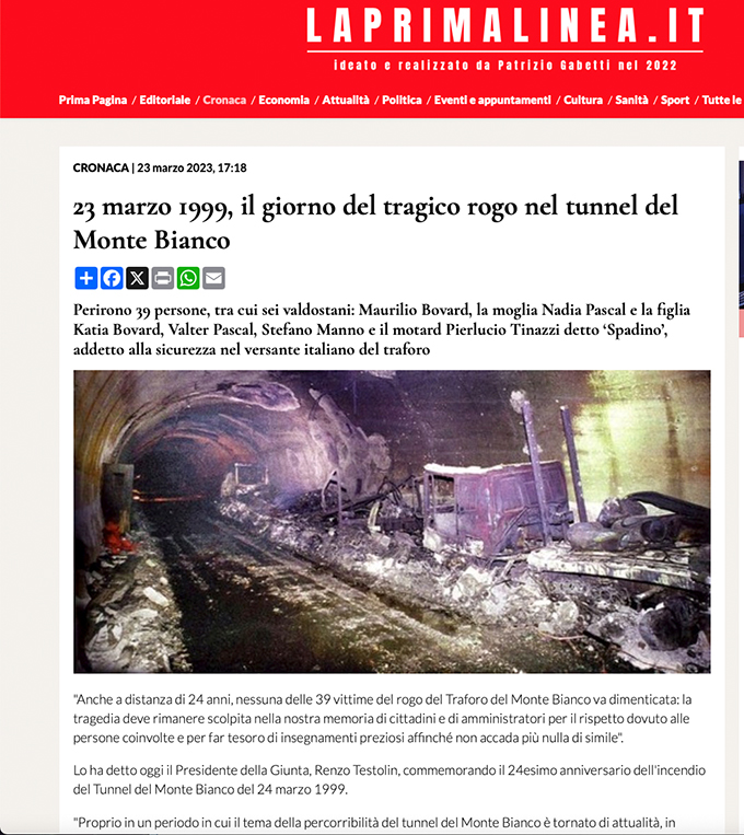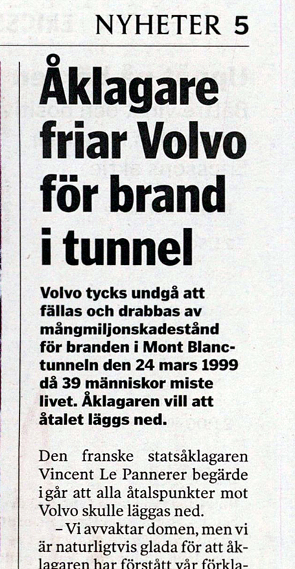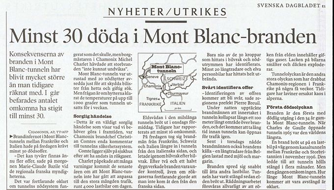 Åkeri. Mitt i den 11 kilometer långa tunneln började Volvo-lastbilen brinna. Några minuter senare var 50 fordon fångade i den giftiga röken. Nu är det 25 år sen branden i Mont Blanctunneln krävde 39 liv.