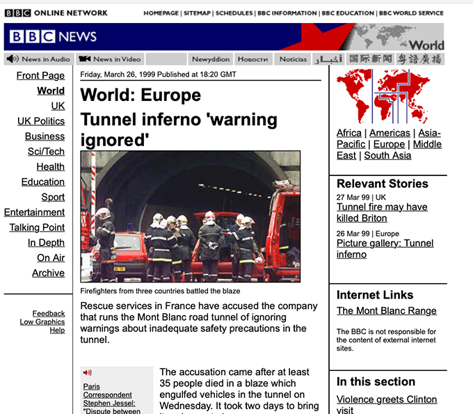 Klockan var 10.46 den 24 mars 1999 när den belgiske lastbilsföraren Gilbert Degrave körde in i den 11 kilometer långa Mont Blanctunneln med sin Volvo FH12.