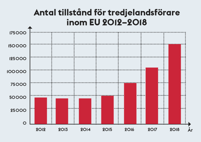 För fem år sedan hade 40 000 chaufförer från länder utanför EU tillstånd att köra internationell trafik inom Europa. Sedan dess har antalet ökat med över 100 000.