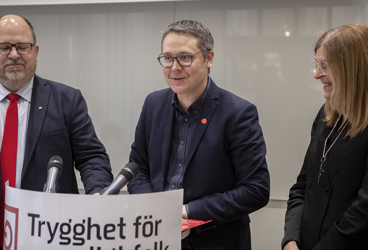 Mellan LO-ledarna Karl-Petter Thorwaldsson och Therese Guovelin står deras kandidat: Johan Danielsson (S). LO ska presentera sin valplattform till EU-valet.