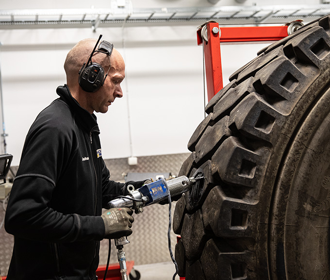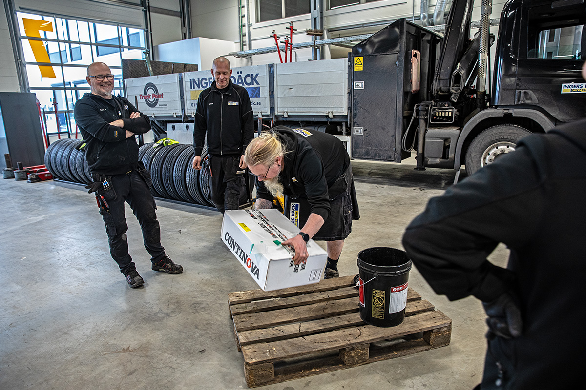 En tät doft av gummi fyller näsborrarna när man kliver in på Ingers däck i Nyköping – efter att platschef Johan Lindén gått igenom verkstans säkerhetsföreskrifter.