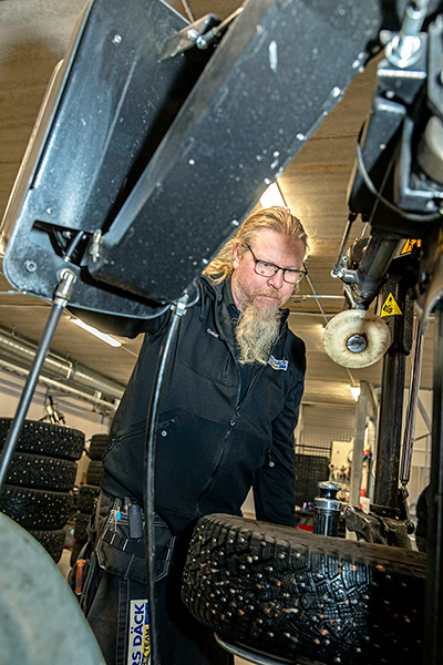 Slammer och ettriga ljud från mutterdragare och monteringsmaskiner överröstar då och då musiken som strömmar ut över personbilsavdelningen. Oskar Wallner skiftar ännu ett av alla däck han hunnit med under sina 28 år i branschen. Och privat?