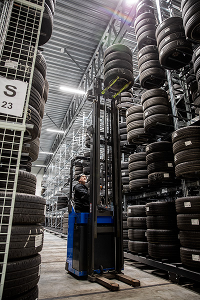 Höjden svindlar. Här tronar drygt 5 400 uppsättningar om 4×4 däck, i väntan på vårrushen.