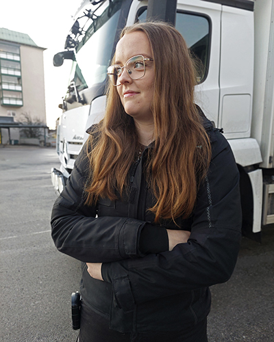 Att vara chaufför trivs hon med. Hon började på naturvetenskapligt program på gymnasiet, men bytte snabbt till fordon och transport. Det har hon aldrig ångrat. Mest gillar hon själva körningen.