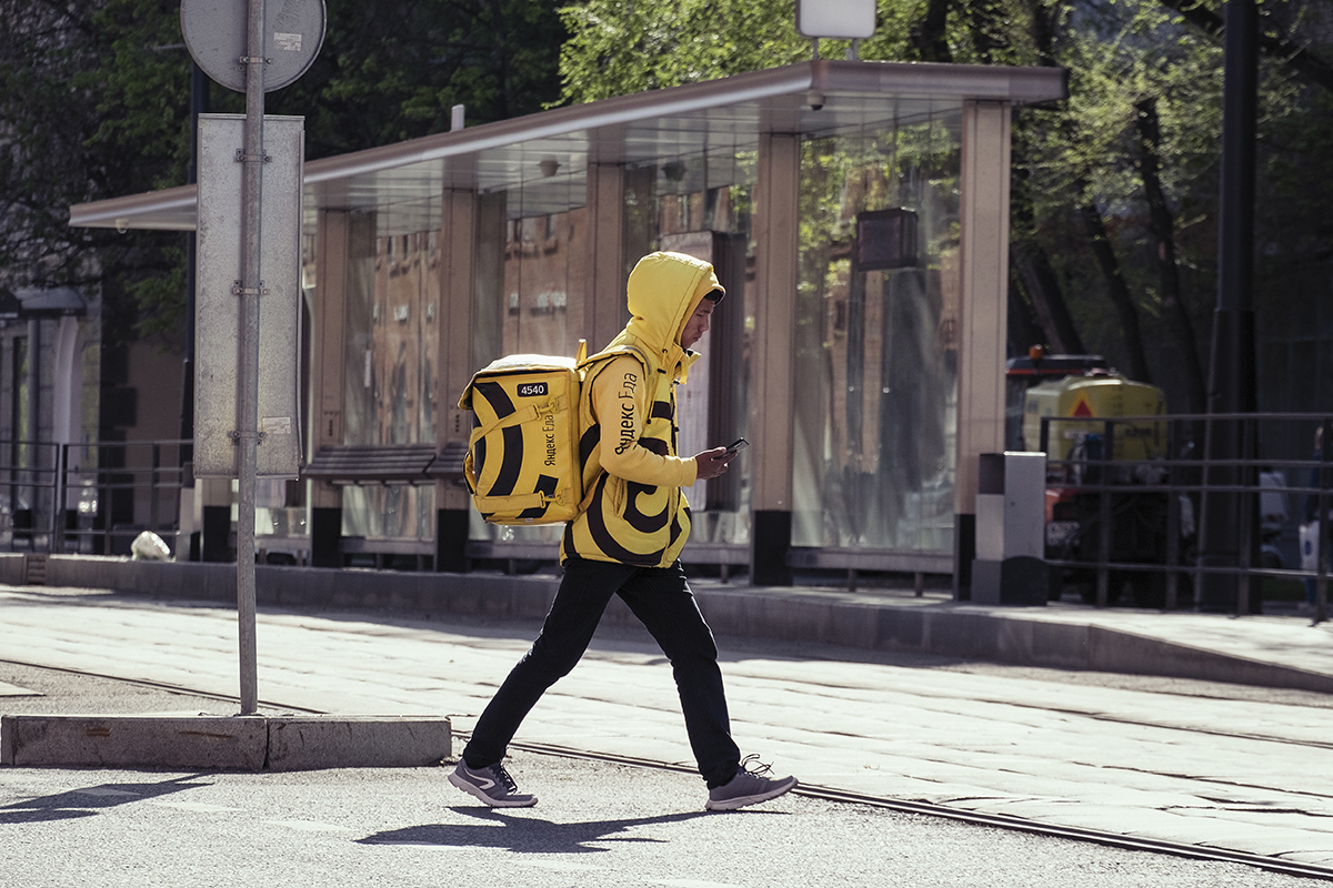 Sedan något drygt år ser man dem överallt i ryska storstäder, unga människor i nästan självlysande gula kläder som bär på stora fyrkantiga ryggsäckar. De flesta går till fots, men en del cyklar eller åker sparkcykel. Oavsett hur de tar sig fram verkar de alltid ha bråttom. De gulklädda är bud som levererar mat från olika restauranger för företaget Yandex.eda.