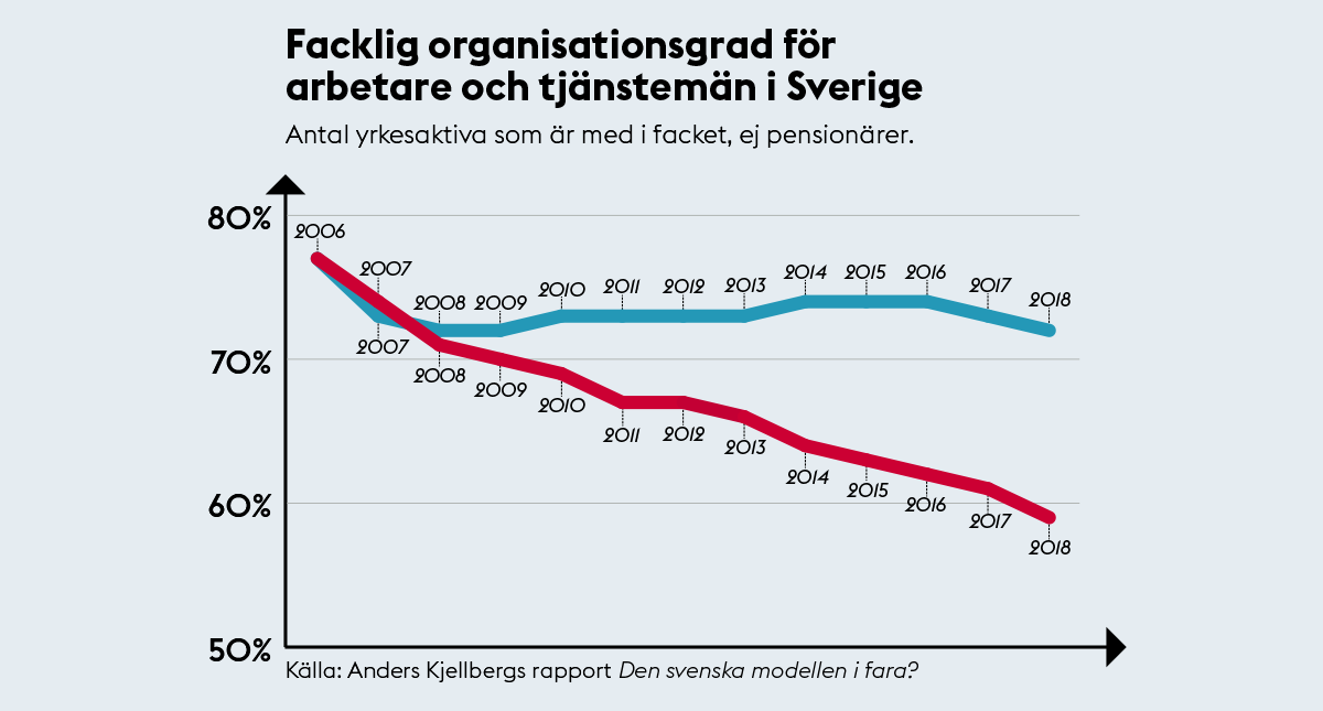 Efter det har nedgången fortsatt. Tjänstemännen, som faktiskt växte under några år, har också börjat backa. I dag är inte ens sex av tio arbetare med i facket. För tjänstemännen är siffran drygt sju av tio.