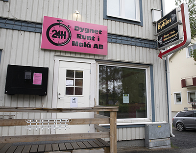 På en grå husfasad i centrum sitter skylten ”Dygnet runt i Malå”. Vid dörren finns en elektronisk tavla. Kunder som vill gå in scannar av en så kallad QR-kod och loggar sedan in med bank-id.