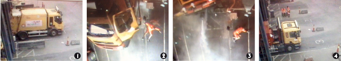 Samtidigt som Peter slår i betonggolvet exploderar en av bilens gastankar. På övervakningsfilmen syns hur den far i väg som en torped ned bland soporna.