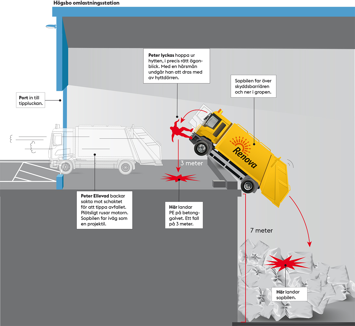 Arbetsskador. Peter Ellevad backar sakta mot schaktet för att tippa avfallet. Plötsligt rusar motorn. Sopbilen far i väg som en projektil, över skyddsbarriären och ner i gropen. Peter lyckas hoppa ur hytten, men får 14 frakturer i fallet. Efteråt exporteras sopbilen till Polen. Utan att den blivit undersökt.