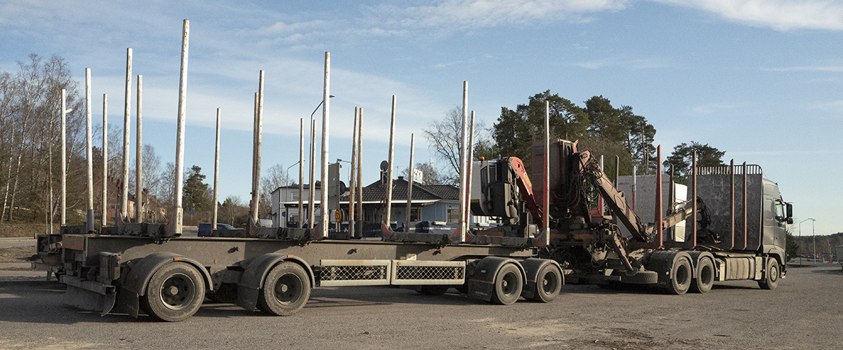 Timmertransporter. På den smala kustvägen genom Norduppland har lastbilstrafiken ökat dramatiskt. Många av bilarna kommer från Baltikum och fraktar papper eller stormfälld skog. Fem av östförarna bor i en sunkig barack på idrottsplatsen i Häverödal.