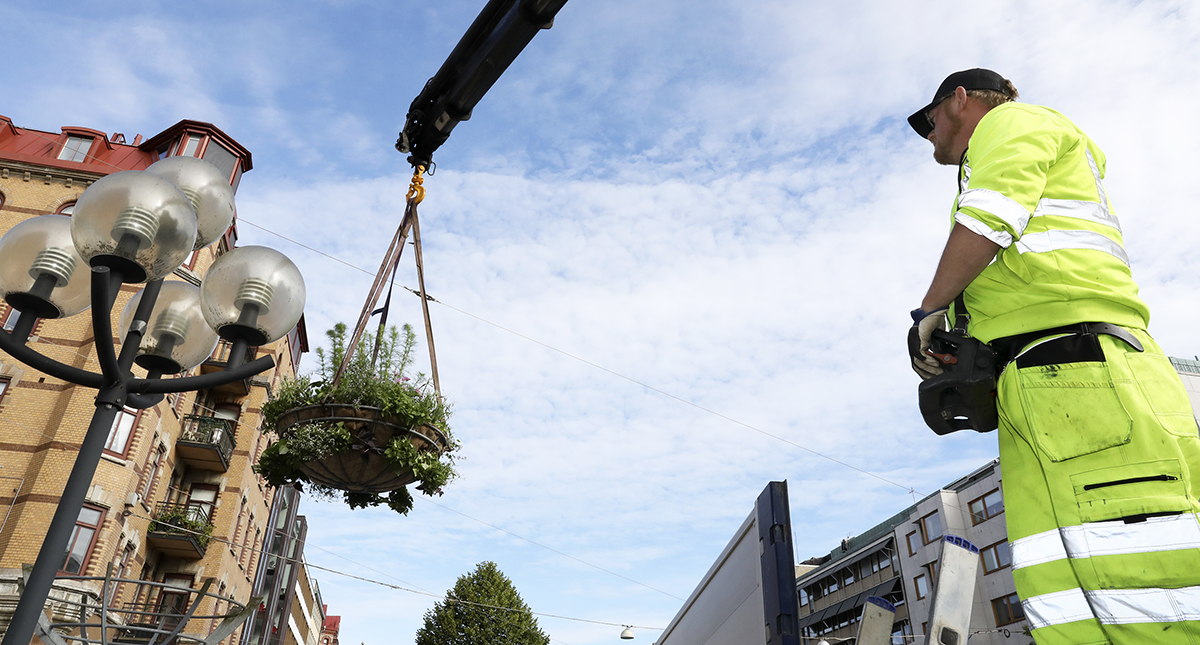 Det är mitt i veckan och solen skiner. Patrik kör Avenyn fram i Göteborg med kranbilen. Han klättrar upp och ner för flaket och manövrerar uppsättningar med blommor på plats i höga ställningar.