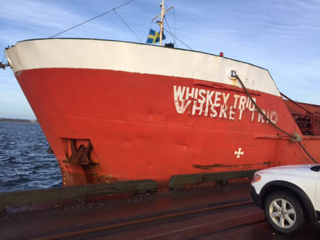 Whiskey Trio ligger vid kaj i Varbergs sedan snart två veckor. Ingen last finns kvar, två andra fartyg har hämtat den.