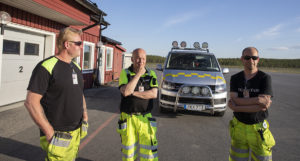 Få ord krävs mellan flygplatsens samkörda trio. Alla vet vad de ska göra när det drar ihop sig till start och landning. Mikael anropar flygtornet från plattan: