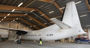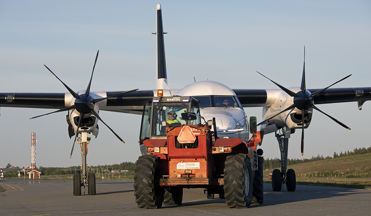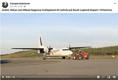 På ett ögonblick har de sina väskor och i nästa sitter André som styrande kapten i planet. Håkan hoppar in i traktorn framför för att bogsera Fokkern bort till nattvila i hangaren. Den är trång, att tråckla sig in kräver precision. I morgon lyfter planet 06, mot Lycksele och Stockholm. Mikael Carlsson gör ett sista inpass: