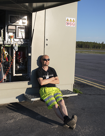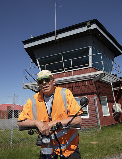 Han är en i trion som varit flygplatsen trogen i 18 år, har varit operativt och tekniskt ansvarig och börjar närma sig pensionen. Att ge sig upp i vargtimman vintertid är tufft, medger han och midnattssolen tär på sömnen.