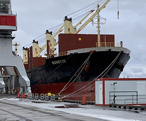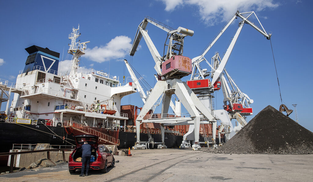 Vid Skeppsholmspirens lastplats lossas den mörka malmen i stora, toppformiga högar. Flera kranförare arbetar med lossningen. Följande vecka kommer fartyget lastas med spannmål.