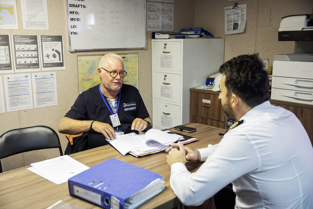 Tillsammans med kaptenen går ITF-inspektören igenom papper och dokument som ska finnas tillgängliga, tittar på kollektivavtalets nivåer och ber att få se löneslippar från samtliga i manskapet (som den här gången enbart består av män) och när de ”signat på” för att se att den maximalt tillåtna tiden ombord på nio månader inte överskridits. Kontrollerar vidare sådant som rör övertid och extra mat-kostnader.