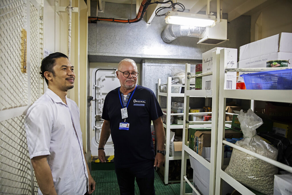 Inspektionen fortsätter dock utan ätande i de båda matsalarna, för officerare respektive för övrigt manskap, och vidare in i ett gym ”litet är bättre än ingenting alls” ned till besättningens hytter och utrymmen för proviant. Göran kollar att allt ser bra ut i frysrummen, separat för fisk och för kött. Nu är chefskocken ”Mr Cool” också med. Han beskriver kosten som ”crossover”, i dag står bland annat biffstuvning med ris på menyn.