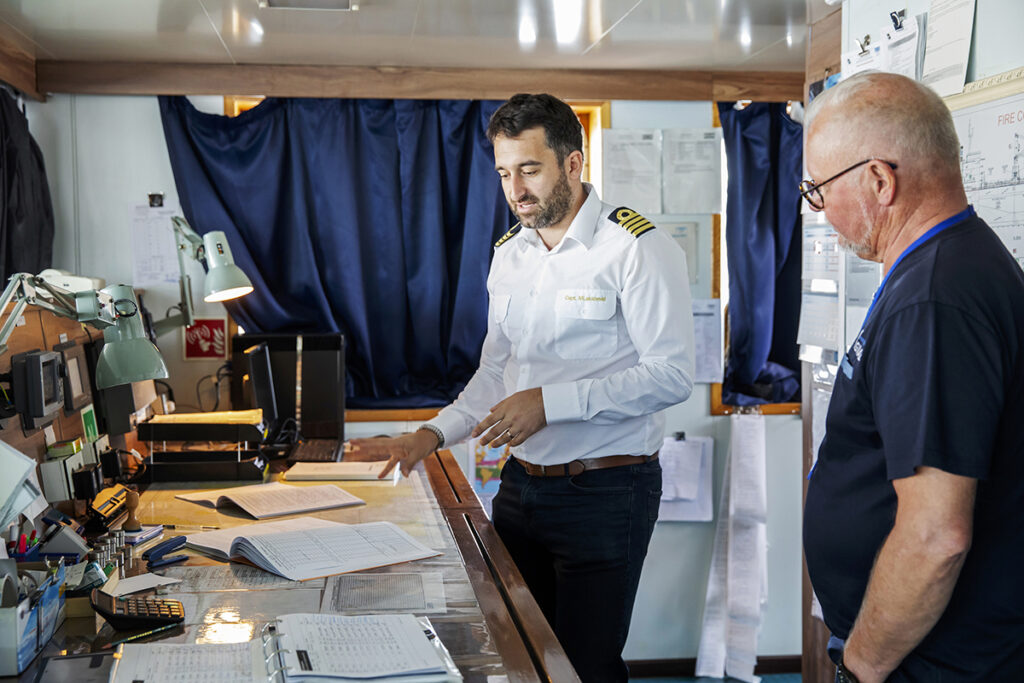 Uppe på kommandobryggan talar han om loggboken med kaptenen. Den är i dag självklart digital. Men trots god uppkoppling och digitalisering bekänner Milutin Lakicevic att de skriver ut det mesta annat på papper. För männen ombord är den stora fördelen med ny teknik framför allt att kunna ha regelbunden kontakt med sina anhöriga hemma, på ett sätt som var omöjligt för bara något årtionde sedan.