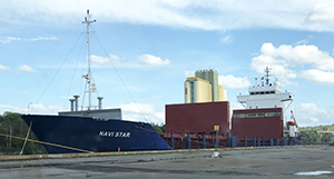 St. Oswald vid kajen är en imponerande syn, över 180 meter lång och med fyra höga kranar. Driften föga överraskande för internationella sjötransporter: Grekiska ägare, registrerad i Bahamas. Besättningen på 18 man är i huvudsak från Filippinerna eller från Ukraina.
