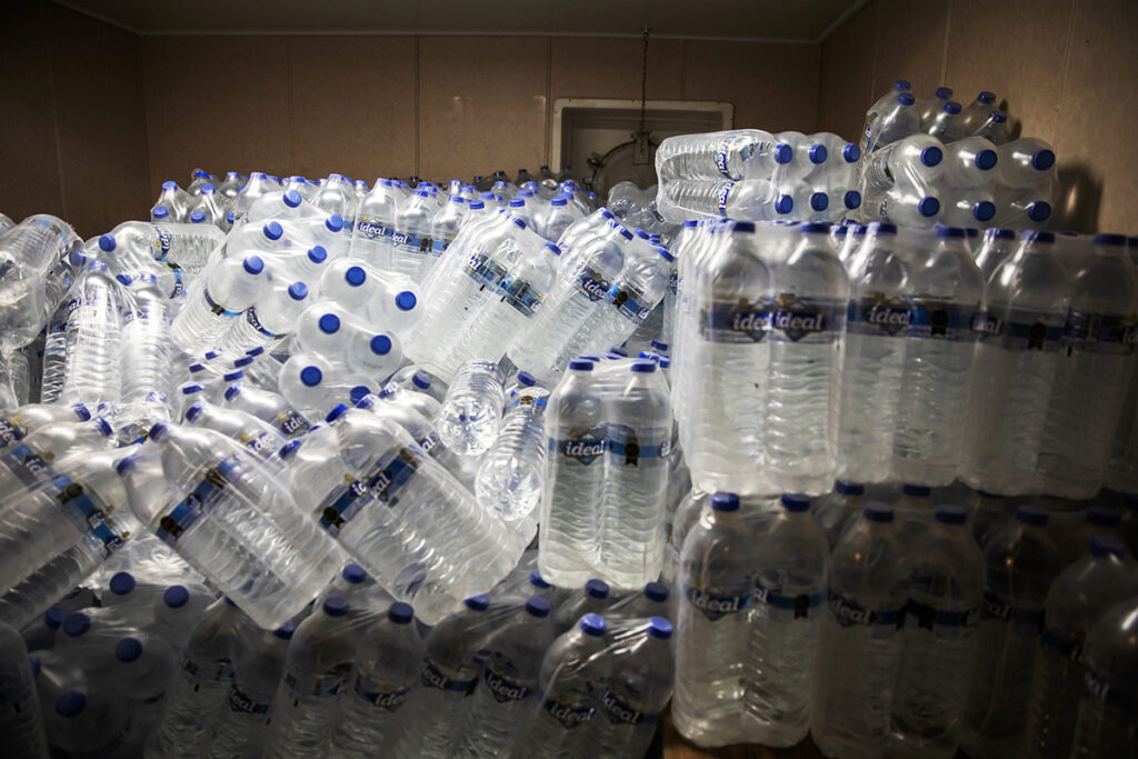 Tusentals buteljer är staplade i ett kylrum. Vatten på plastflaskor.