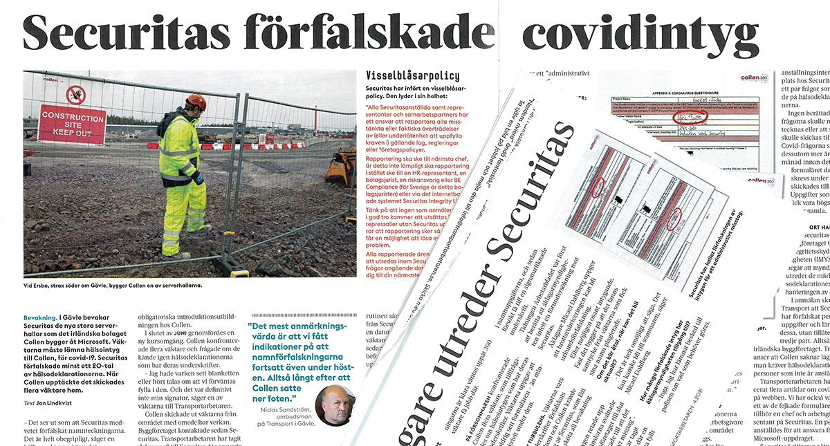 I början av förra året skrev Transportarbetaren om hur bevakningsbolaget misstänktes förfalska coronaintyg för att snabbt kunna ordna med den bevakningspersonal som behövdes.
