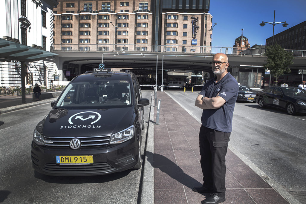 Taxi. Solen skiner på taxibilarna vid den stora ingången till Stockholms centralstation. Rent ekonomiskt är det fortfarande ett mörker. Varje kund är önskvärd, men kan också vara den som skickar förarna in i en sjukdom som kan vara livsfarlig.
