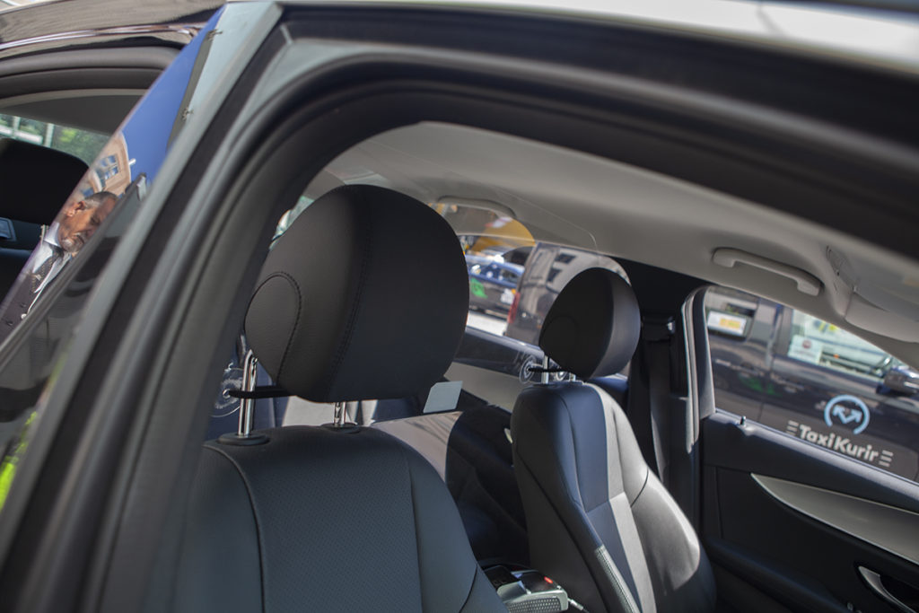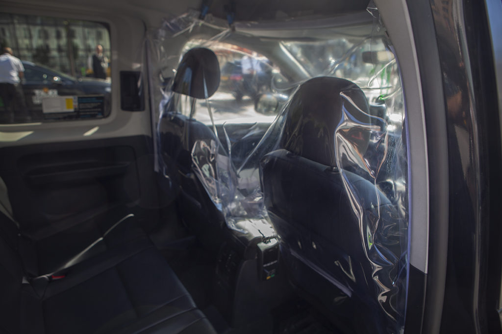 En chaufför visar plexiglaset som satts upp mellan fram- och baksätet.