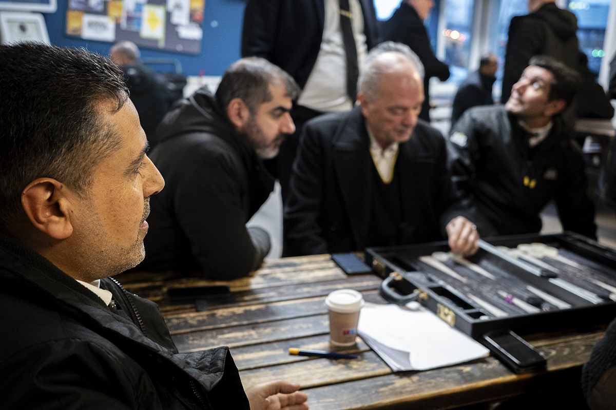 Sahir Dramme visar in i huset som domineras av en stor öppen lokal, där taxiförarna står, går eller sitter vid de hopbyggda borden och bänkarna – avsedda för utomhusbruk. Färgen är avskavd efter långa sittningar med träsmak, utan ryggstöd. Att restaurangen klappat igen innebär att förarnas utrymme krympt. Men kring två på eftermiddagen är trängseln inte så stor som på morgnarna, berättar Sahir Dramme.