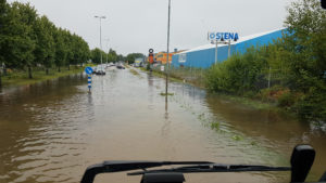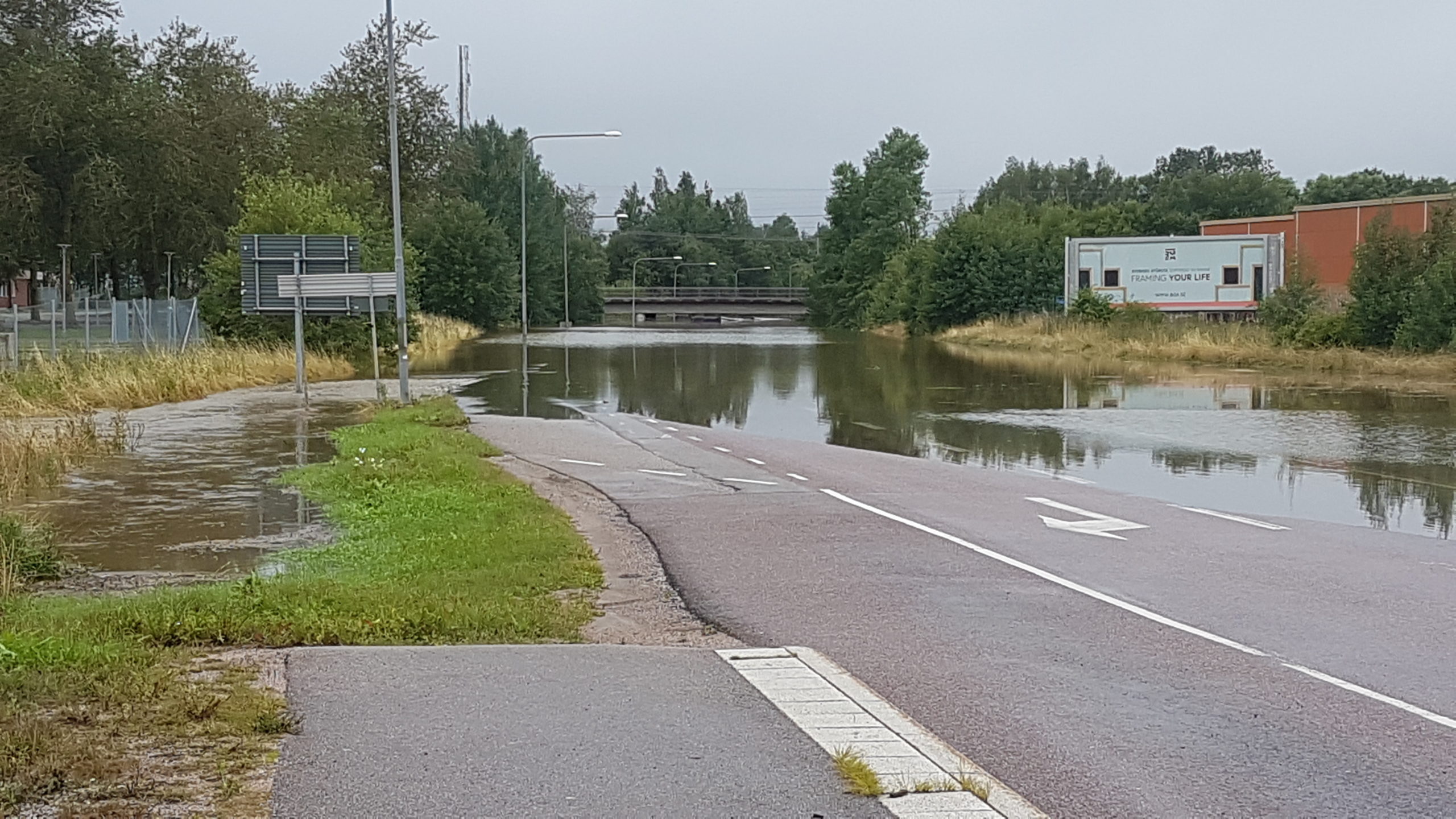 Ett sådant ställe är under järnvägsviadukten över Upplandsleden, nära Schenker i Gävle. Vägen går här i en djup försänkning under bron. På eftermiddagen stod vattnet enligt uppgift 4,5 meter högt i ”gropen”.