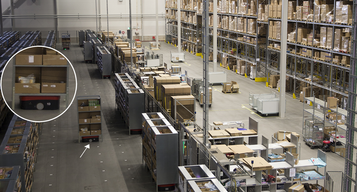 Det tar en liten stund innan man får se den första ”nyckelpigan” dyka upp. En röd robot som tar sikte på en varuhylla, lyfter den och kör i väg utmed något som liknar spårvagnsspår i golvet.