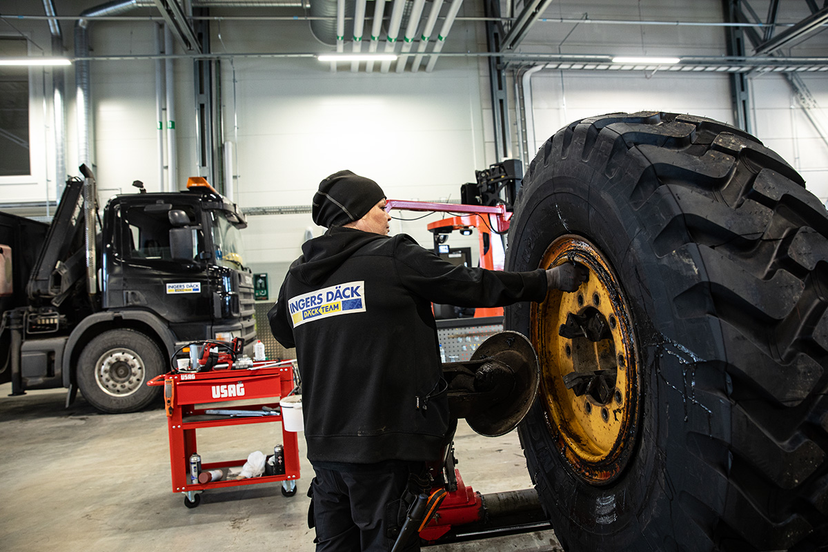 Gummiverkstad. Rockbandet Slade ljuder ur högtalarna och smält snö droppar i håret på däckmontörerna i splitternya lokaler vid däckverkstan Ingers däck. Men vem är Inger? Tungbilsmontören som rycker ut heter Jennie.