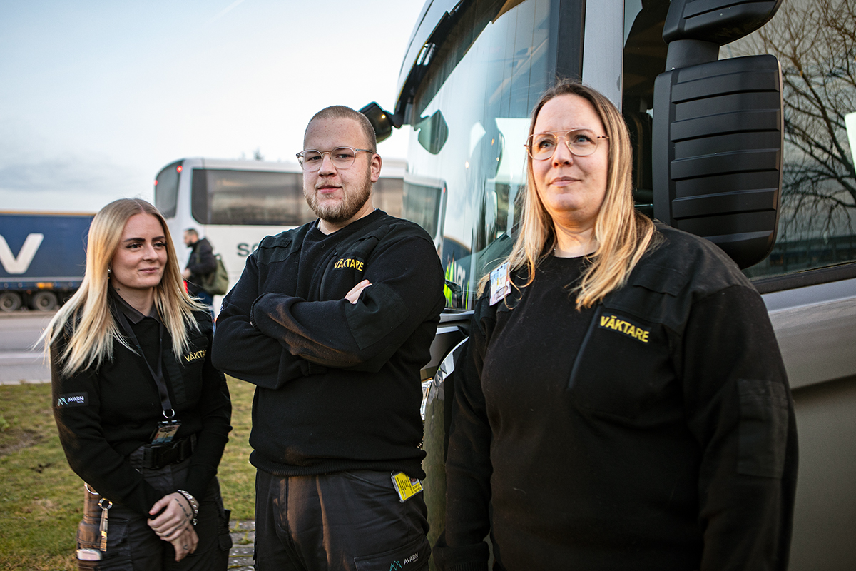 Linnea Hammarqvist, Patrik Nilsson och Ida Hallberg utanför Scania där Avarn Security tog över bevakningsuppdraget sommaren 2024. Och där Ida klev in som Transportombud. Foto: Lilly Hallberg