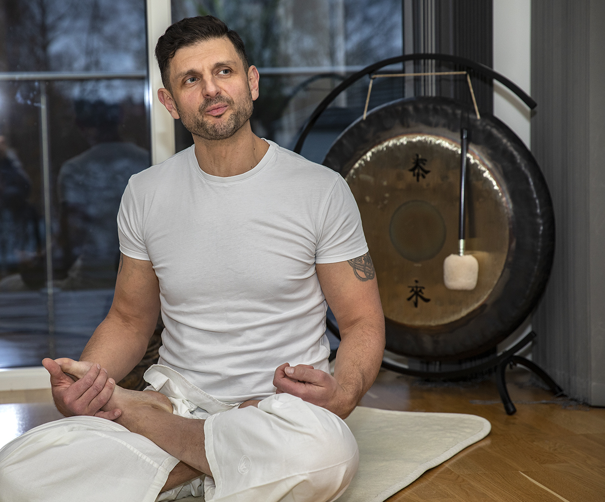 Kropp och själ. Ordningsvakten Alen Omerbasic Majstorovic börjar varje morgon med en kall dusch. Så blandar han gurkmeja i varmt vatten, dricker och brer ut yogamattan.