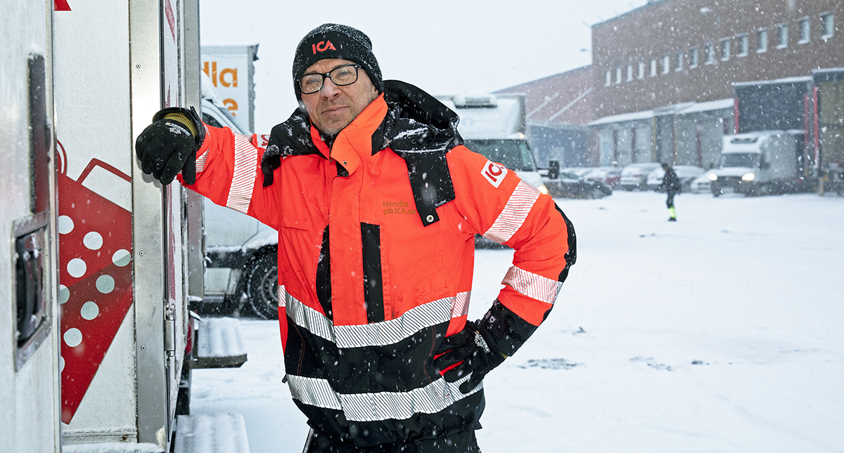 Klubbordförande och skyddsombud Niclas Gustafsson i snöyran vid Icas lager.