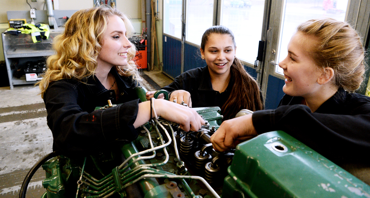 Johanna Thoresson (i mitten på bilden) går första året på fordons- och transportprogrammet på Nifsarpsskolan i Eksjö. Sett över landets gymnasier är en av fyra blivande lastbilsförare kvinna. Andelen är densamma på Nifsarpsskolan.