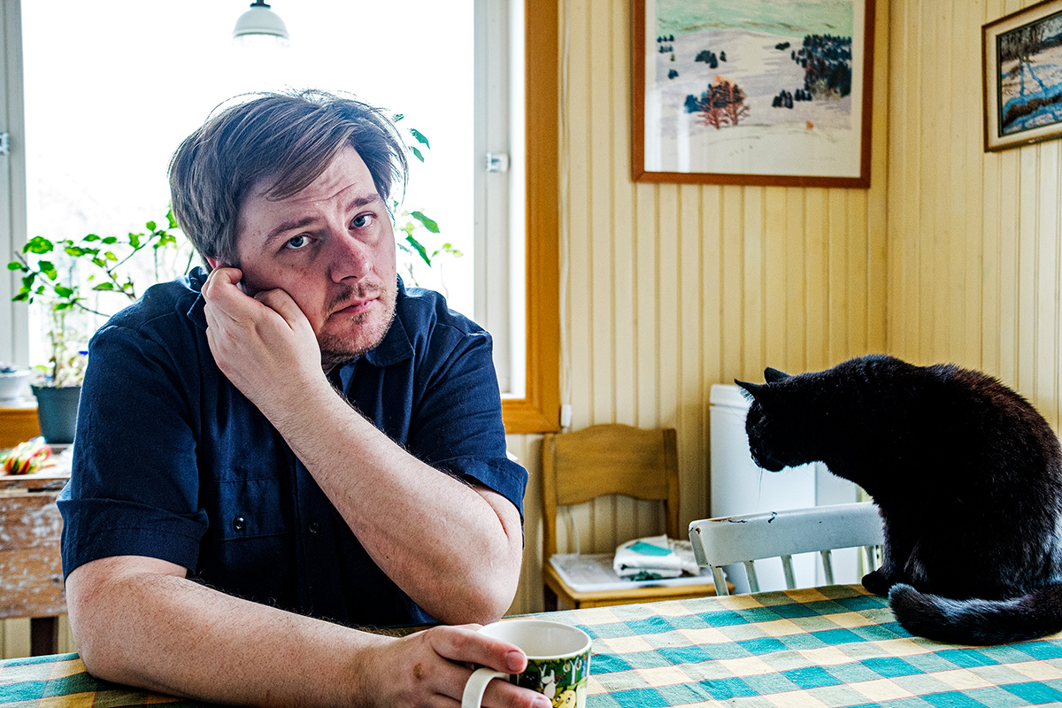 Han tittar på en av sina katter och berättar att det blivit en stor omställning. För nu ska han själv vara en karaktär i böckerna. Han har fått kämpa med att rita sig själv på ett sätt som funkar. Flera gånger om har hans sambo stoppat honom och sagt: ”nej, så där ser du inte ut”.