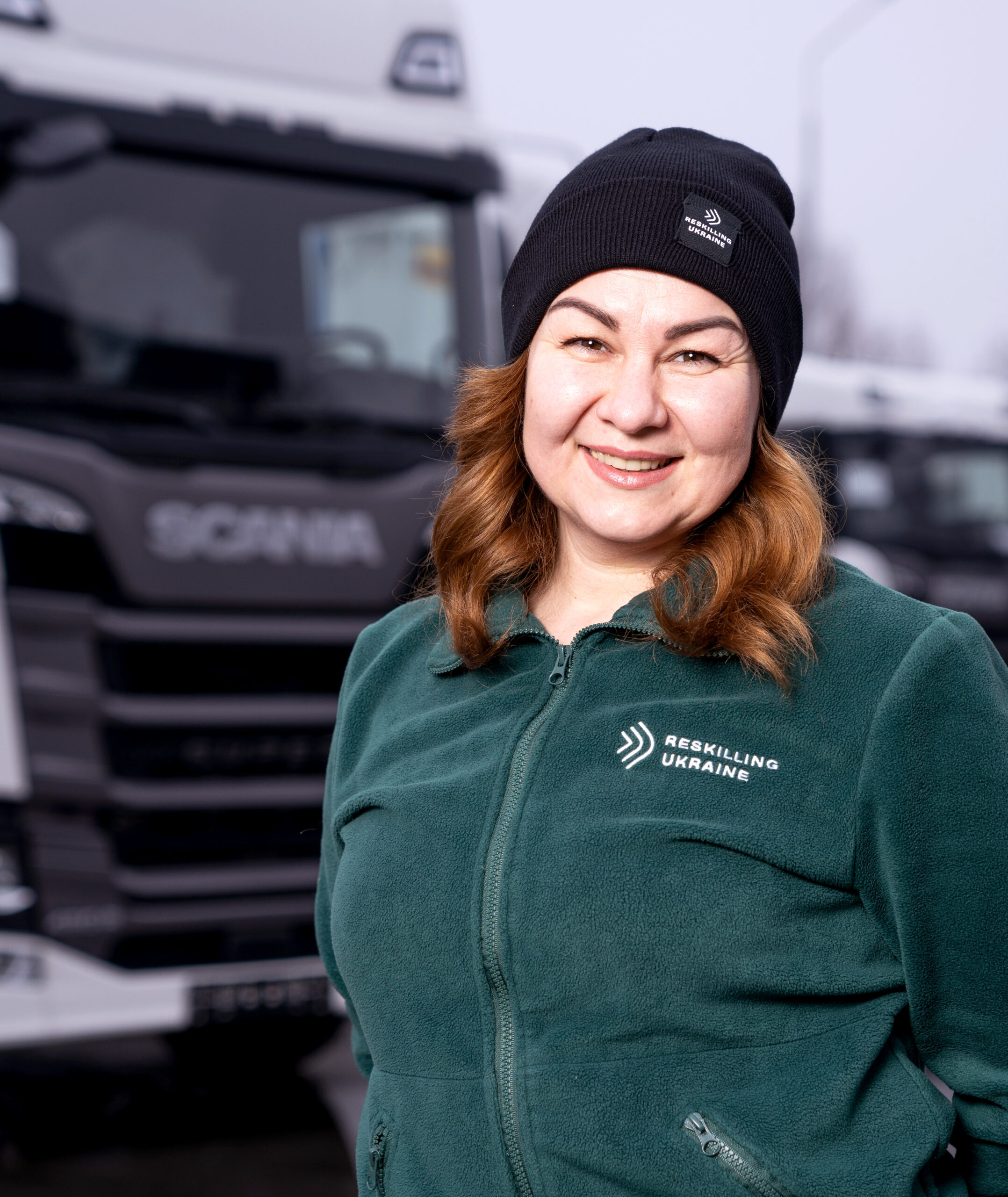 Hon har fortfarande inte riktigt kunnat ta in att hon gått chaufförsutbildningen och ska börja jobba inom ett helt nytt arbetsområde. Lina Samborska har tidigare haft ledande befattningar inom tandvård och brandsäkerhet så att hon skulle landa i transportbranschen hade hon aldrig kunnat föreställa sig. Före kriget. Men hon är trygg i att hon kommer att klara av det.