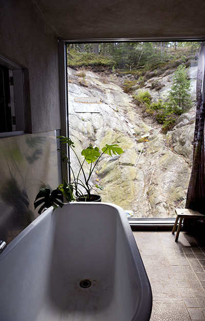 Återvunnet är i alla fall badkaret på fot i badrummet med andlös utsikt mot berget i mossgrönt och grått. Lugna färger som går igen i industristilen inomhus. Bägge trapporna mellan våningarna är uppfångade från rivningshus. Lägg till det fynd på Blocket.