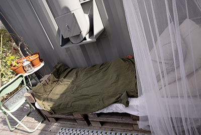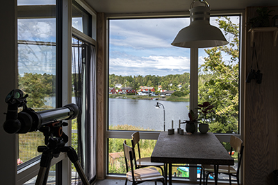På husets rymliga terrass (containertak) finns både odlingar, dagbädd, bord och stolar. Där sitter Thomas och följer grågäss, fiskgjusar, häger och tranor kring sjön. Bäver finns och rådjur och räv stryker kring huset med stora specialbeställda fönster. Att slita bort containergolvet var ett hästjobb, konstaterar han.