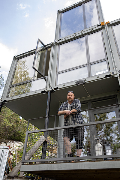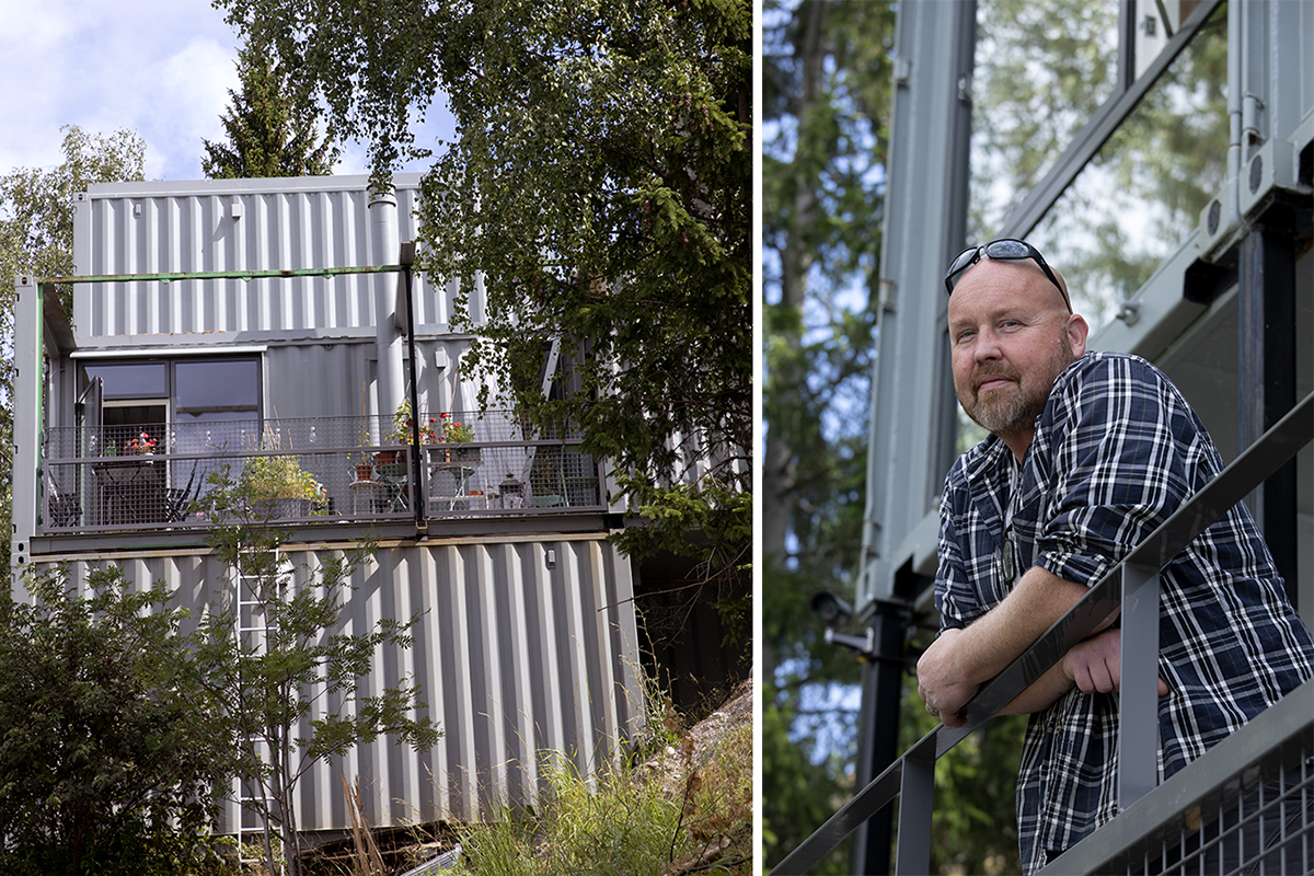 Husbygge. Inbäddat i grönskan och infogat efter ett berg ligger det: lastbilsföraren Thomas Jacobssons och familjens hus. Byggklossarna är åtta sjöcontainrar, som fraktats haven runt. Och landat på Värmdö, utanför Stockholm.